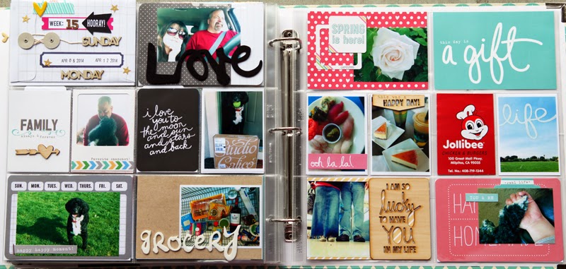 Hi welcome to my blog. I'd like to share my Project life Week 14 spreads with you today. During this week, I went out with girl friend for dinner. It was fun. So I am using tons of Elle's Studio goodies for this week. I used some from both of the March and April exclusive kits. And also from other releases to combine with my Studio Calico Project Life kit. And the cute weekdays wood veneer is from Chic Tags.